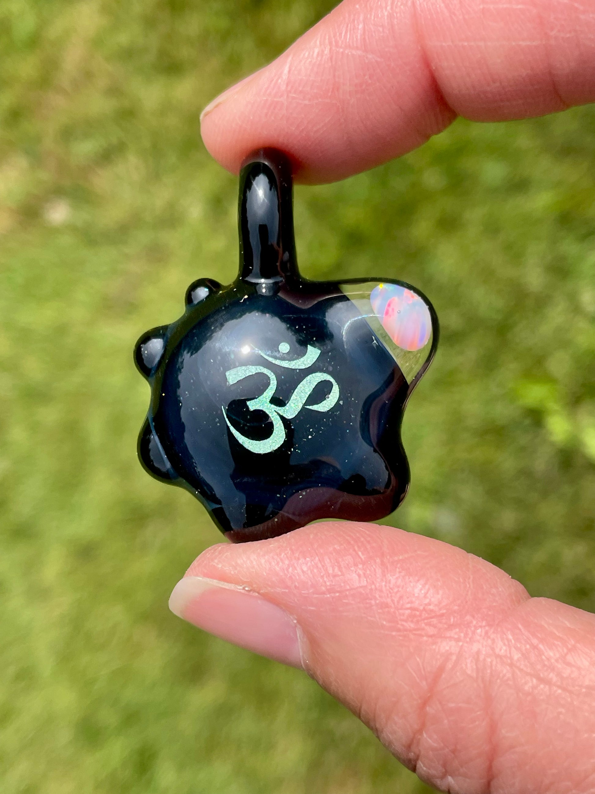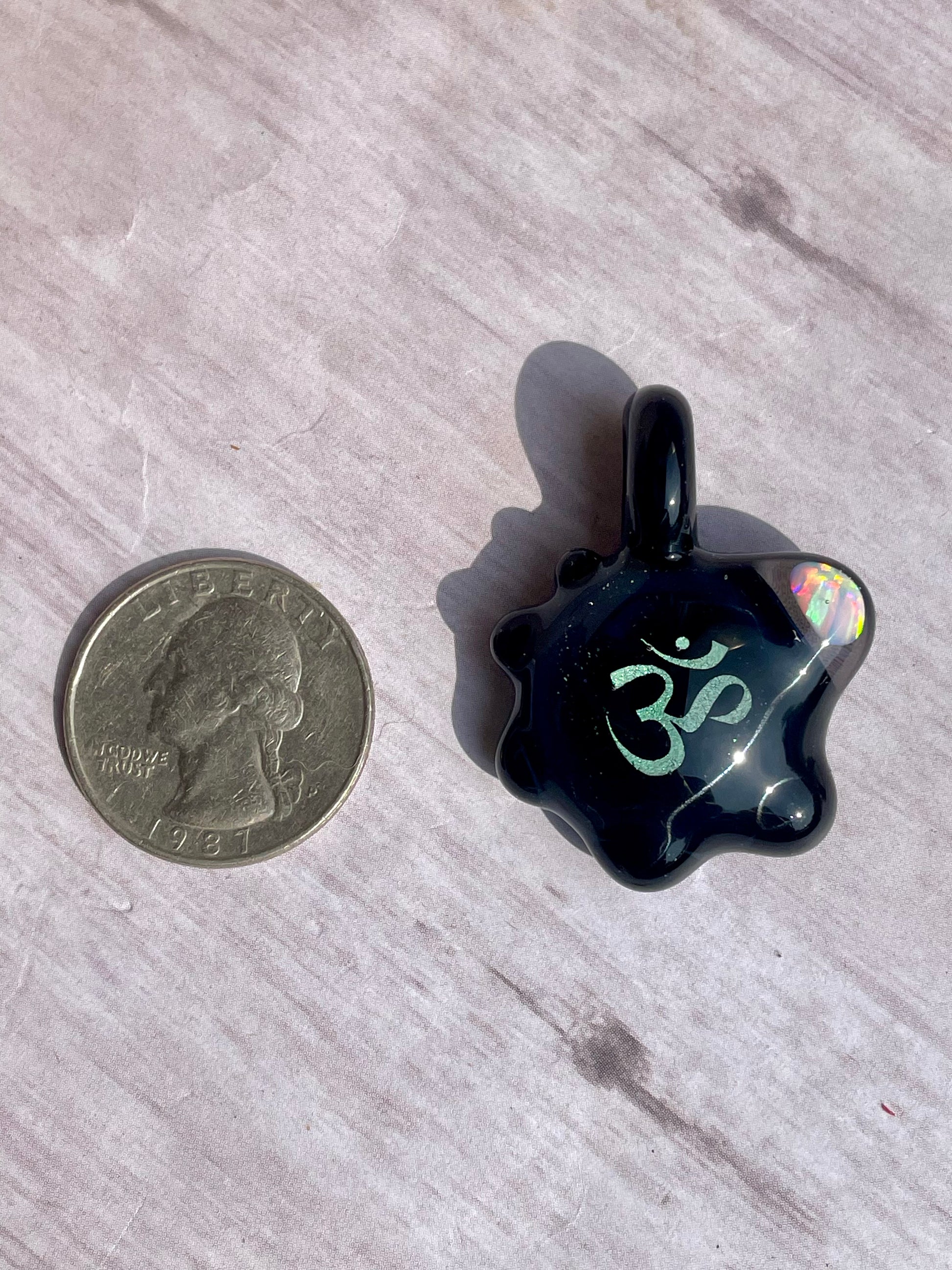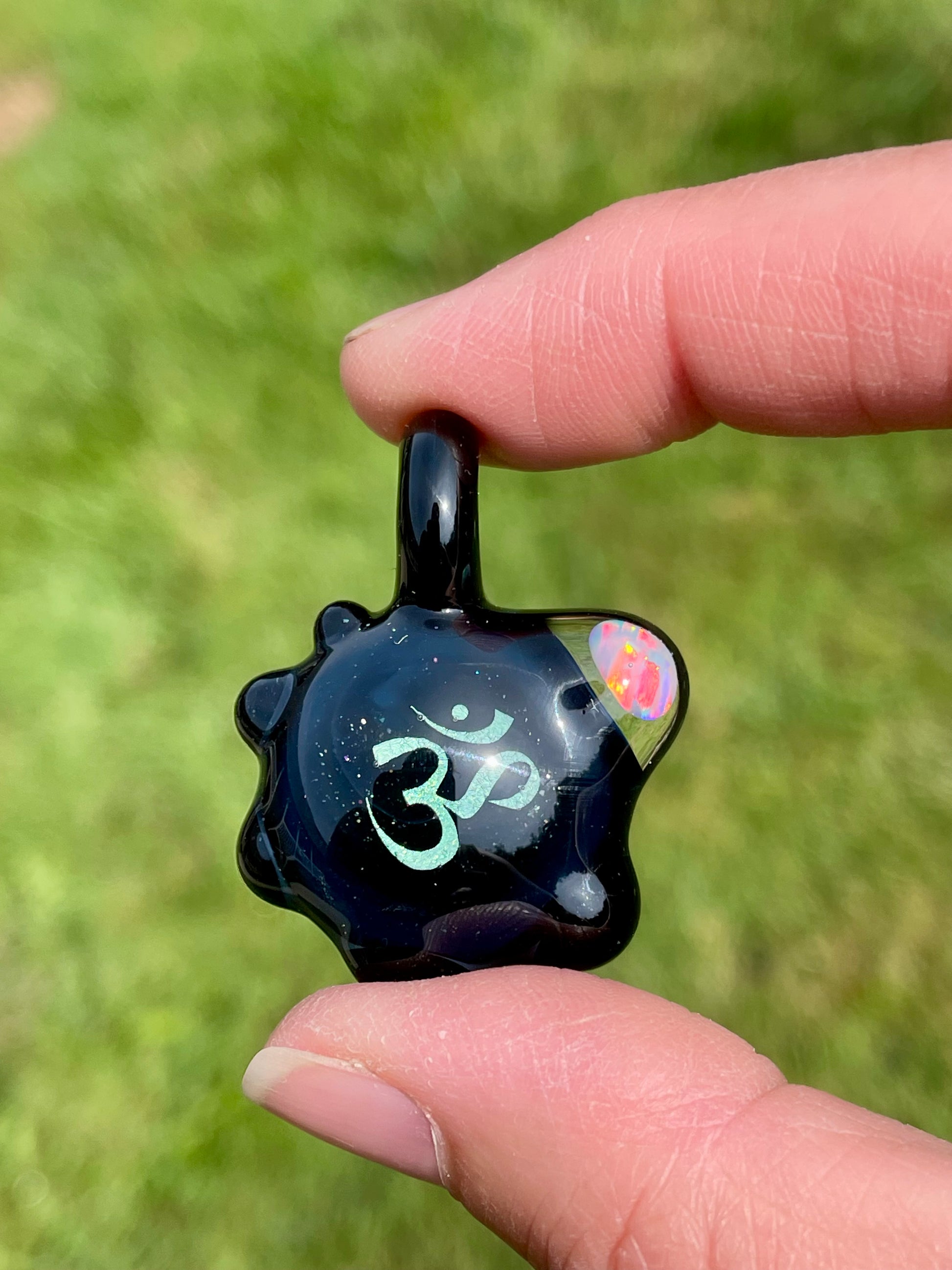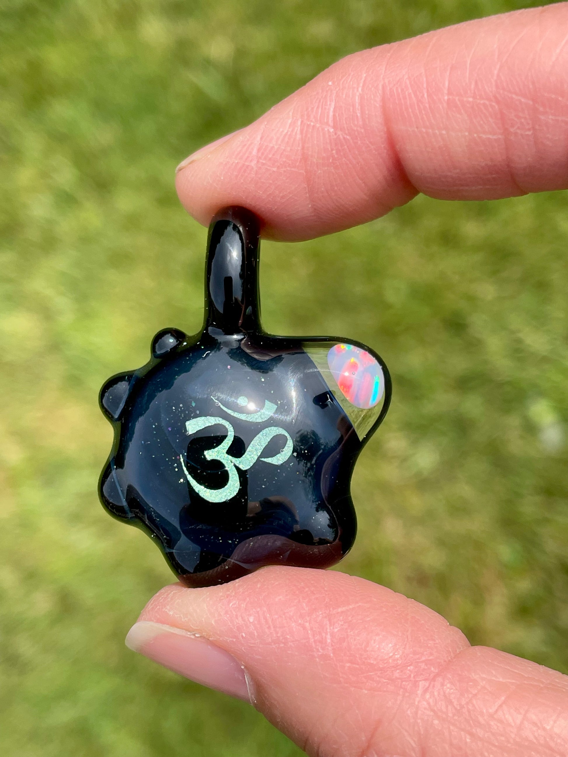 Do you know someone who is big on meditation and yoga and who cherishes the Aum symbol and finding their inner self through deep meditation? This is the perfect and unique gift for them! Blown Glass Aum/Om Dichroic Image Pendant features an opal drop. Image is encased in a deep sparkly black. Dichroic image is titanium fumed on glass. Pendant is hand made with love out of borosilicate glass. Great gift for someone who is into meditation and yoga, as this symbolizes the sacred symbol of hinduism.