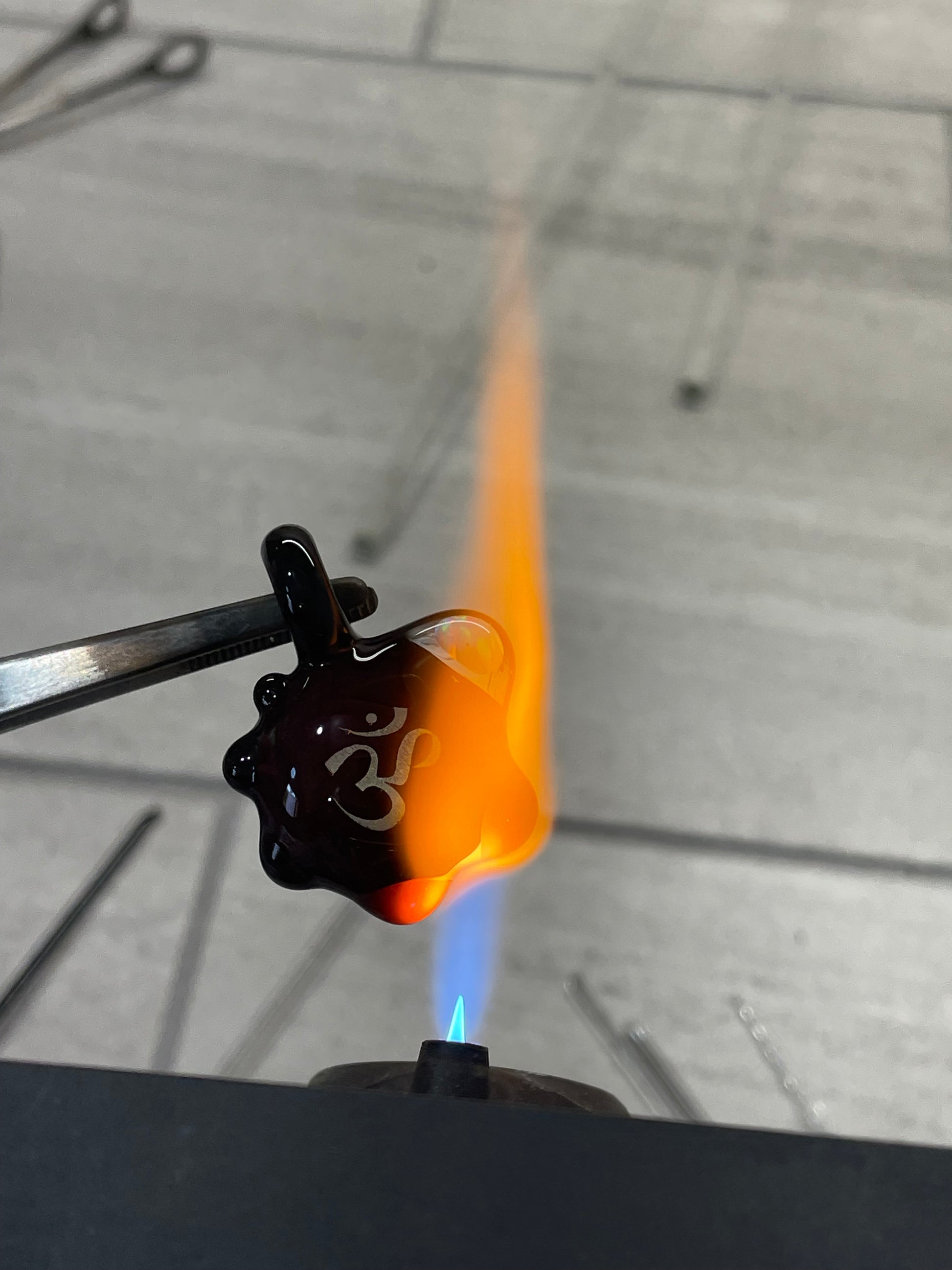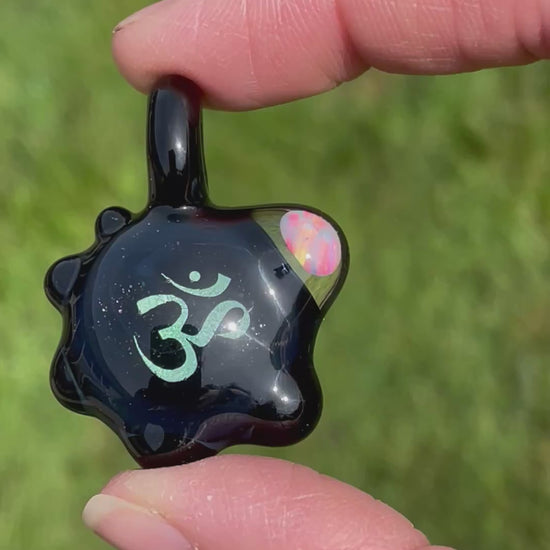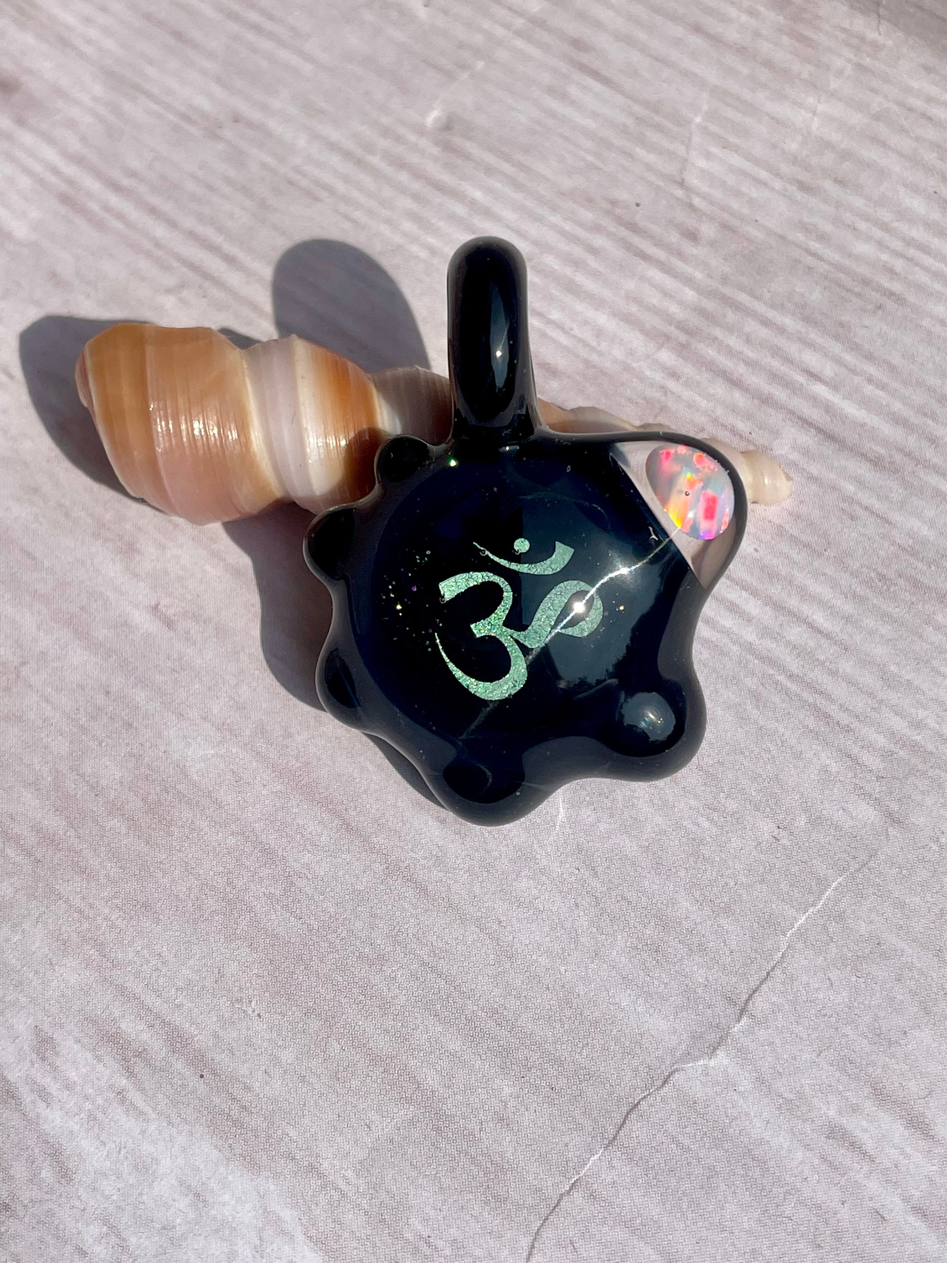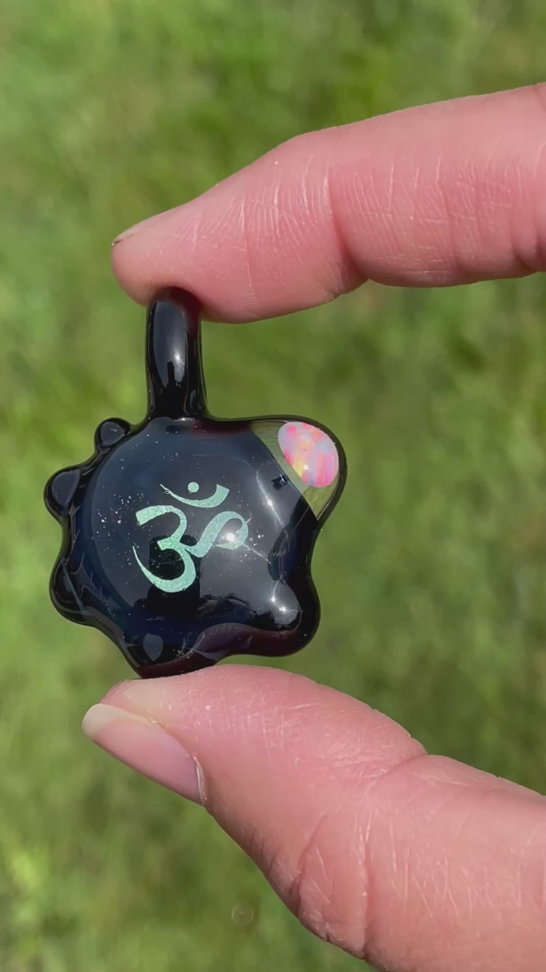 Do you know someone who is big on meditation and yoga and who cherishes the Aum symbol and finding their inner self through deep meditation? This is the perfect and unique gift for them! Blown Glass Aum/Om Dichroic Image Pendant features an opal drop. Image is encased in a deep sparkly black. Dichroic image is titanium fumed on glass. Pendant is hand made with love out of borosilicate glass. Great gift for someone who is into meditation and yoga, as this symbolizes the sacred symbol of hinduism.